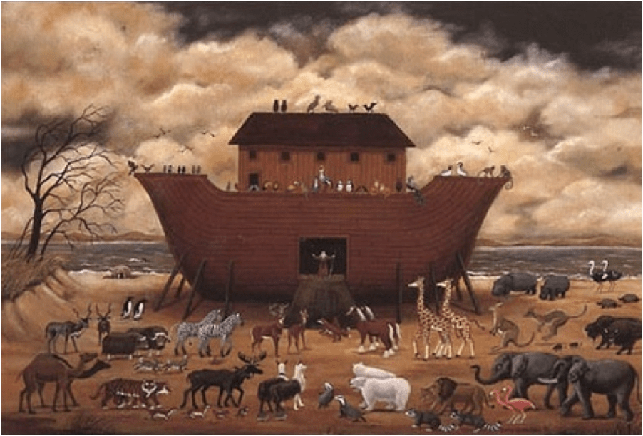 Noah’s Arc as illustrated by John James Norton. Ironically, though ships are made to float and cities can’t, building ecocities on elevated artificial mounds of earth would help save endangered species by helping prevent the portion of climate change attributable to sprawl development with all its massive output of carbon dioxide.